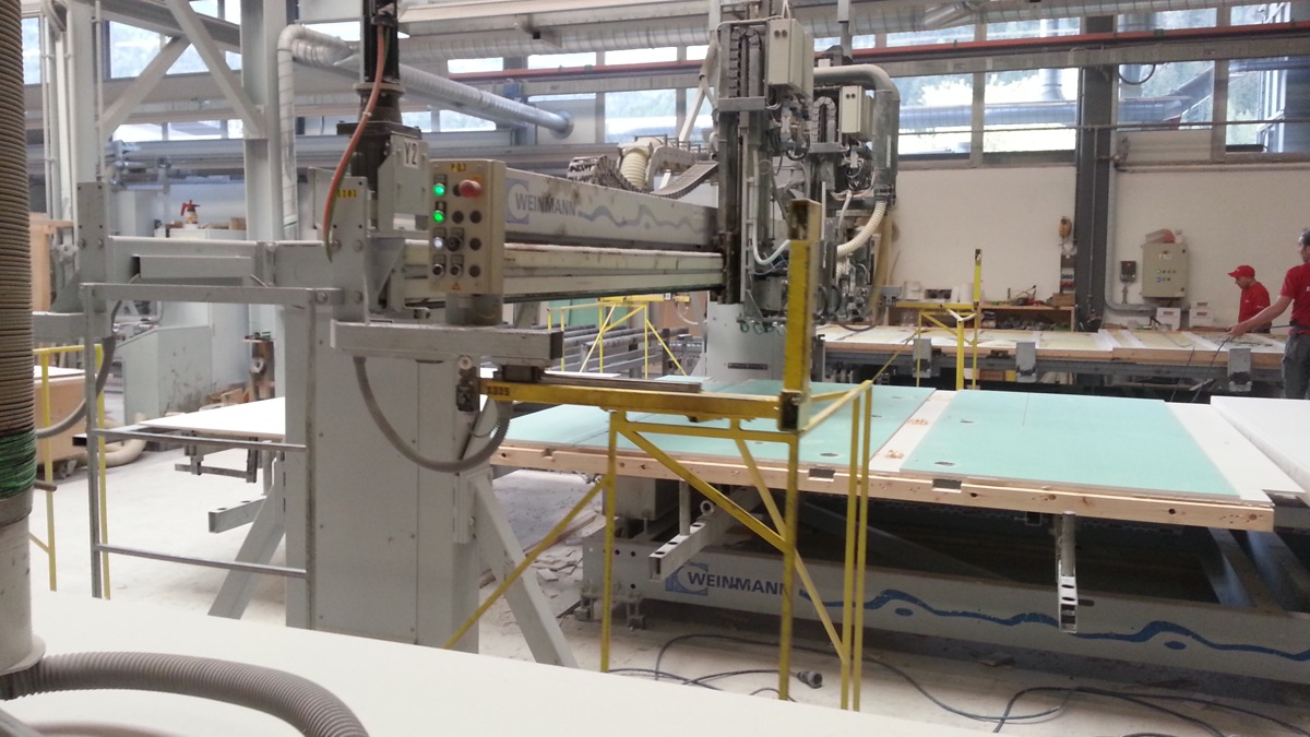 foto 1 Una volta eseguita la progettazione esecutiva dell’edificio da realizzare, tutte le parti in legno (travi, montanti, tavolati, ecc.) vengono realizzate con macchine a controllo numerico che tagliano, forano, fresano, predispongono gli incastri, il tutto è realizzato in modo perfetto e computerizzato. A questo punto tutti i pezzi sono stati numerati e sono pronti per il montaggio che avviene effettuato secondo il progetto e senza alcuna possibilità di errore da manodopera specializzata sui dei grandi banchi automatizzati che consentiranno di movimentare le pareti per le successive fasi di lavorazione.