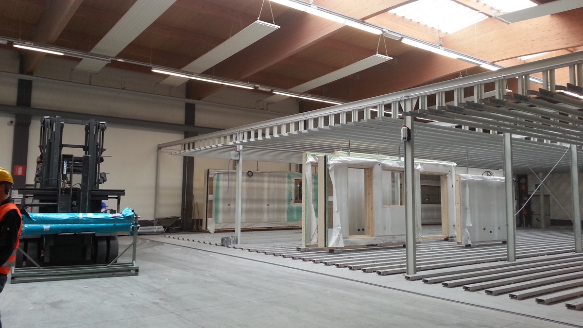 ora le pareti sono pronte per essere caricate, nella corretta sequenza, sui camion che le porteranno a destinazione, dove in qualche settimana verrà montato ed ultimato l’edificio.